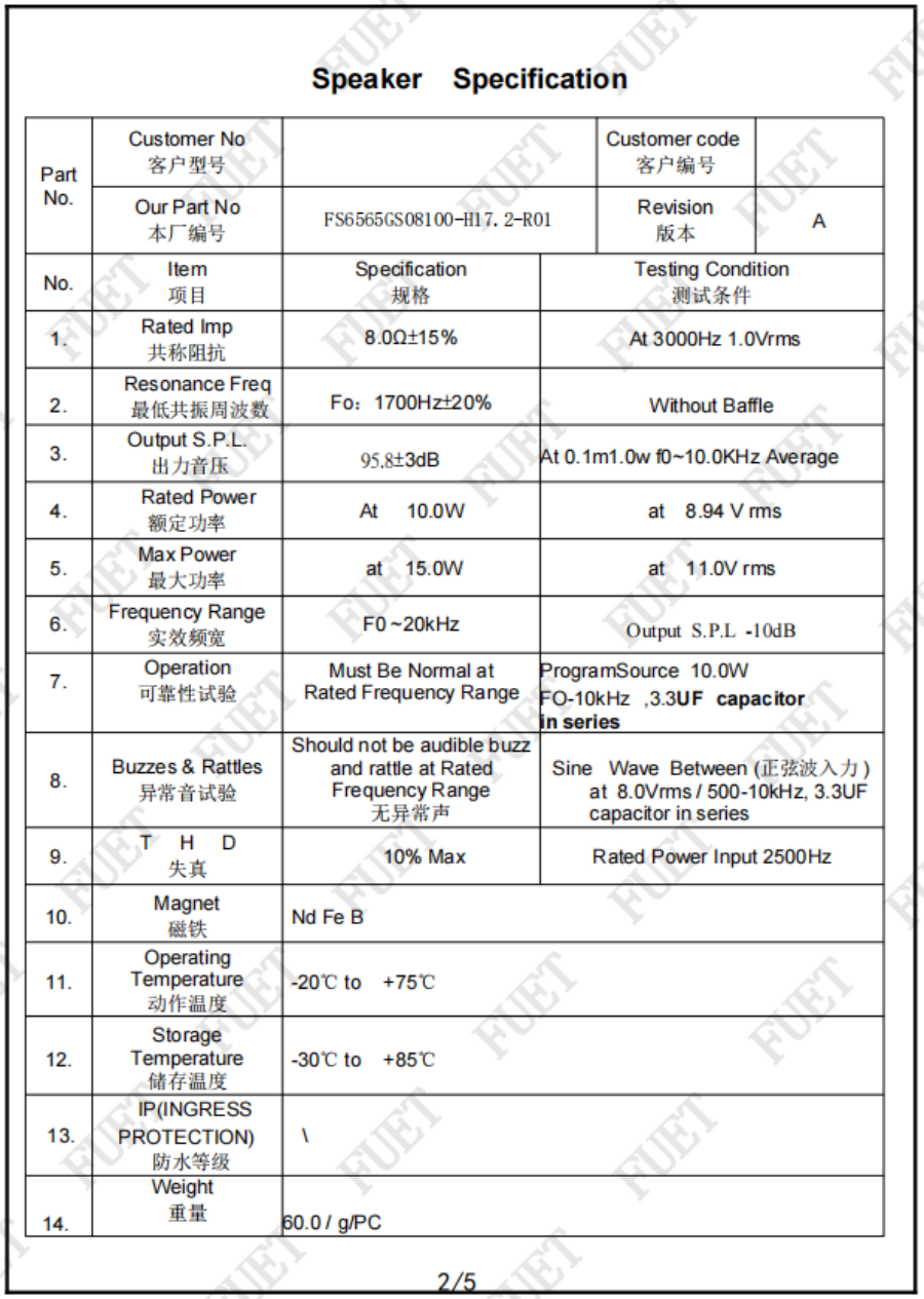 最低共振周波數(shù) 1700Hz±20% Without Baffle